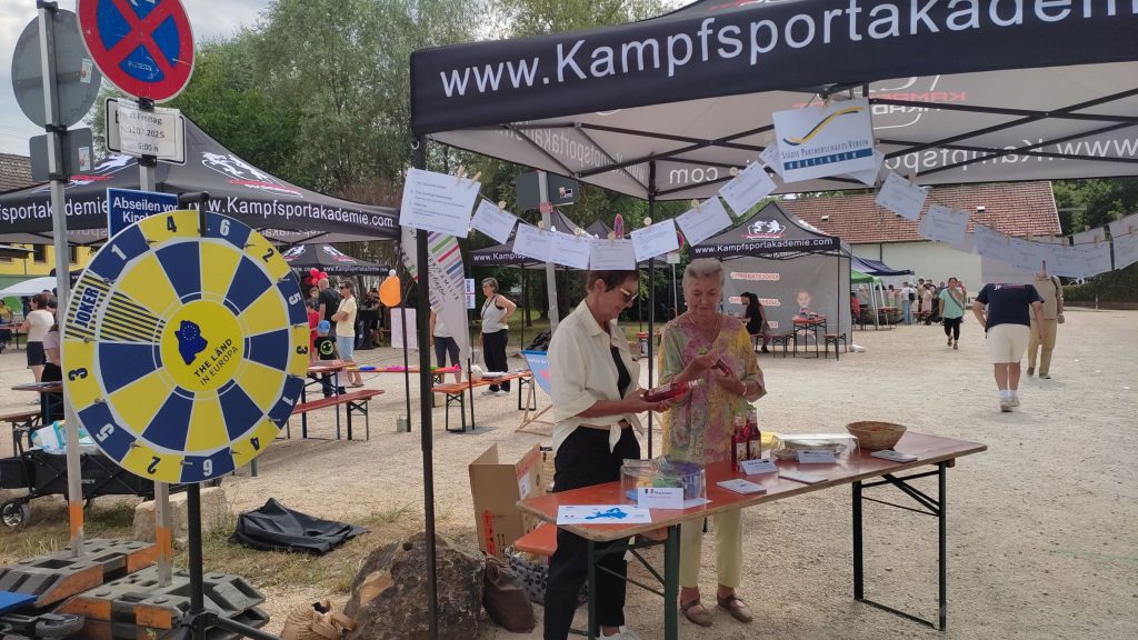Wie schnell erreicht man mit der Bahn die Partnerstädte? Und wo stehen die meisten Windräder? Welche Sportart wird in Soroksár auf hohem Niveau sehr erfolgreich praktiziert und wo spielt Zerbst in der ersten Bundesliga mit? Seit wann besteht die Städtepartnerschaft mit Oullins und wie war das noch mit Katharina der Großen und Zerbst? (hier geht´s zu den Antworten) Diese, und andere spannende Quizfragen konnte man beim Neckarfest am Stand des Städtepartnerschaftsvereins beantworten und kleine Preise dafür abräumen. Keine leichten Fragen – aber damit wollte der Verein das Interesse an Nürtingens Partnerstädten Oullins-Pierre-Bénite in Frankreich, Rhondda Cynon Taf in Wales, Soroksár in Ungarn und Zerbst in Sachsen-Anhalt wecken und die Partnerstädte den Nürtingern näherbringen. Während meist Kinder am Glücksrad drehten und damit eine der 24 Quizfragen auswählten, wurden die Eltern bei der Beantwortung der anspruchsvollen Fragen zu Rate gezogen. Zu gewinnen gab es süße Köstlichkeiten aus den Partnerstädten und als Trostpreis immerhin noch ein kleiner Schokogruß aus Waldenbuch. Bleibt allen Mitspielern und Organisatoren zu sagen merci, diolch, közönöm und danke.
