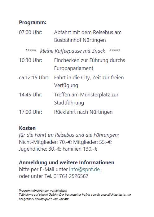 Kostenbeitrag für die Fahrt im Reisebus ab Nürtingen und für die Führungen: Nicht-Mitglieder: 70,-€; Mitglieder: 55,-€; Jugendliche: 30,-€; Familien 130,-€